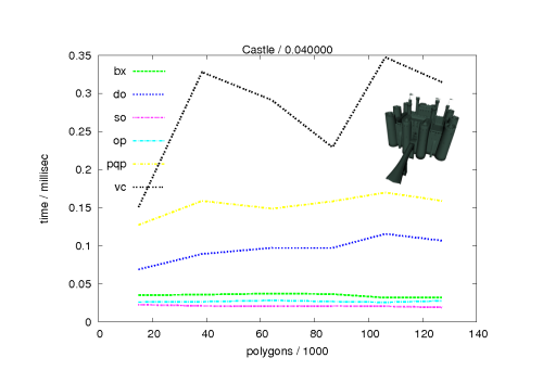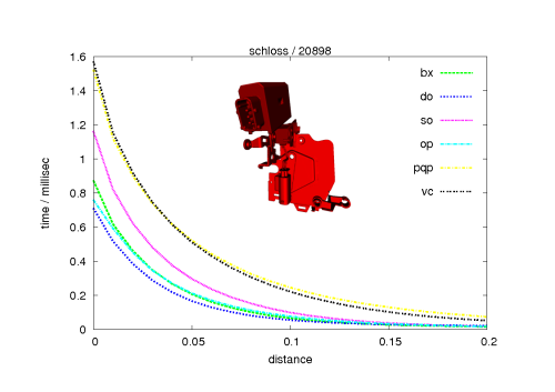 The diagrams show the performance of our library ("bx" marks the Boxtree and "do" the DopTree) compared to other collision detection libraries, namely, V-Collide ("vc"), PQP, OPCODE ("op"), and FreeSOLID ("so"). For further information about our Benchmarking Suite, including a description of the benchmarking procedure, and much more diagrams, please visit our project homepage.